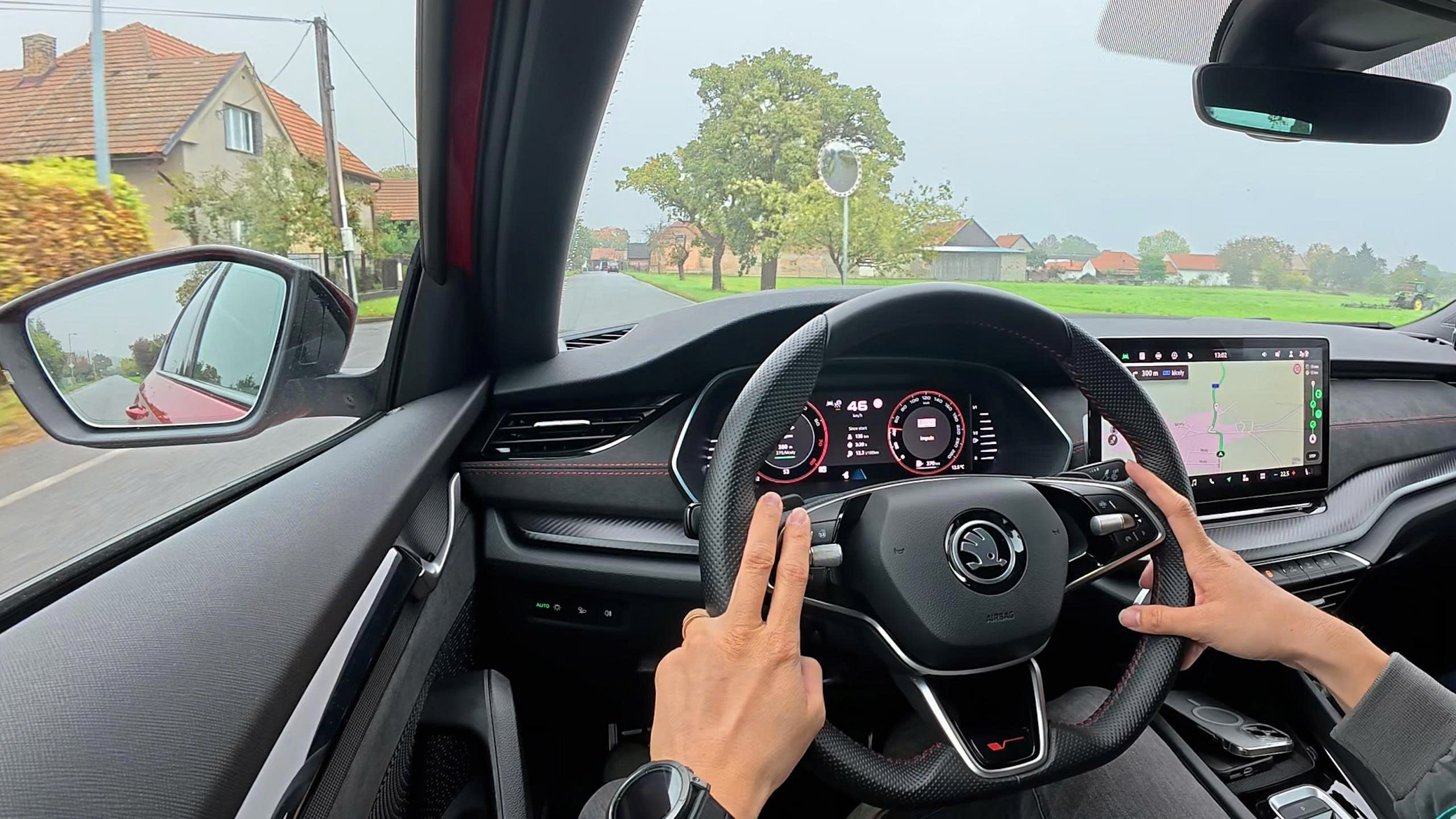 Trên cung đường rừng vắng, Octavia RS thể hiện đúng chất thể thao châu Âu: mạnh mẽ nhưng không hoang dại, nhanh nhưng vẫn tinh tế. Cảm giác lái cân bằng, thân xe ổn định và đặc biệt là độ bám cầu trước cực tốt, hầu như không xuất hiện hiện tượng understeer dù vào cua ở tốc độ cao. Hệ thống treo và khung gầm — được chia sẻ từ nền tảng Volkswagen — mang đến độ chắc chắn đặc trưng của xe Đức, trong khi cách Skoda tinh chỉnh khiến mọi thứ “vừa đủ”, không quá khô cứng như Golf GTI, cũng không mềm như những mẫu Nhật cùng tầm.